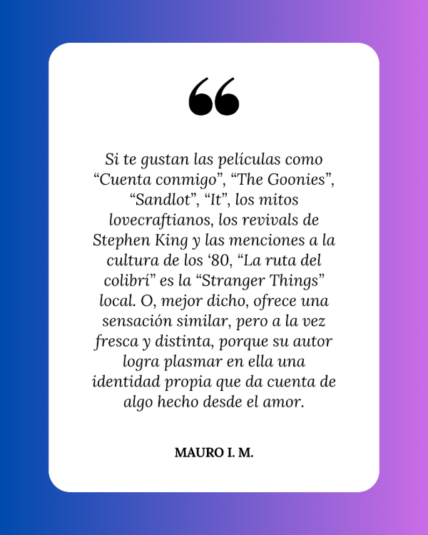 "La ruta del colibrí" es una historia sobre la pérdida de la inocencia, el duelo, y esa clase de lealtad desesperada que solo los adolescentes —y los idiotas— son capaces de sostener.